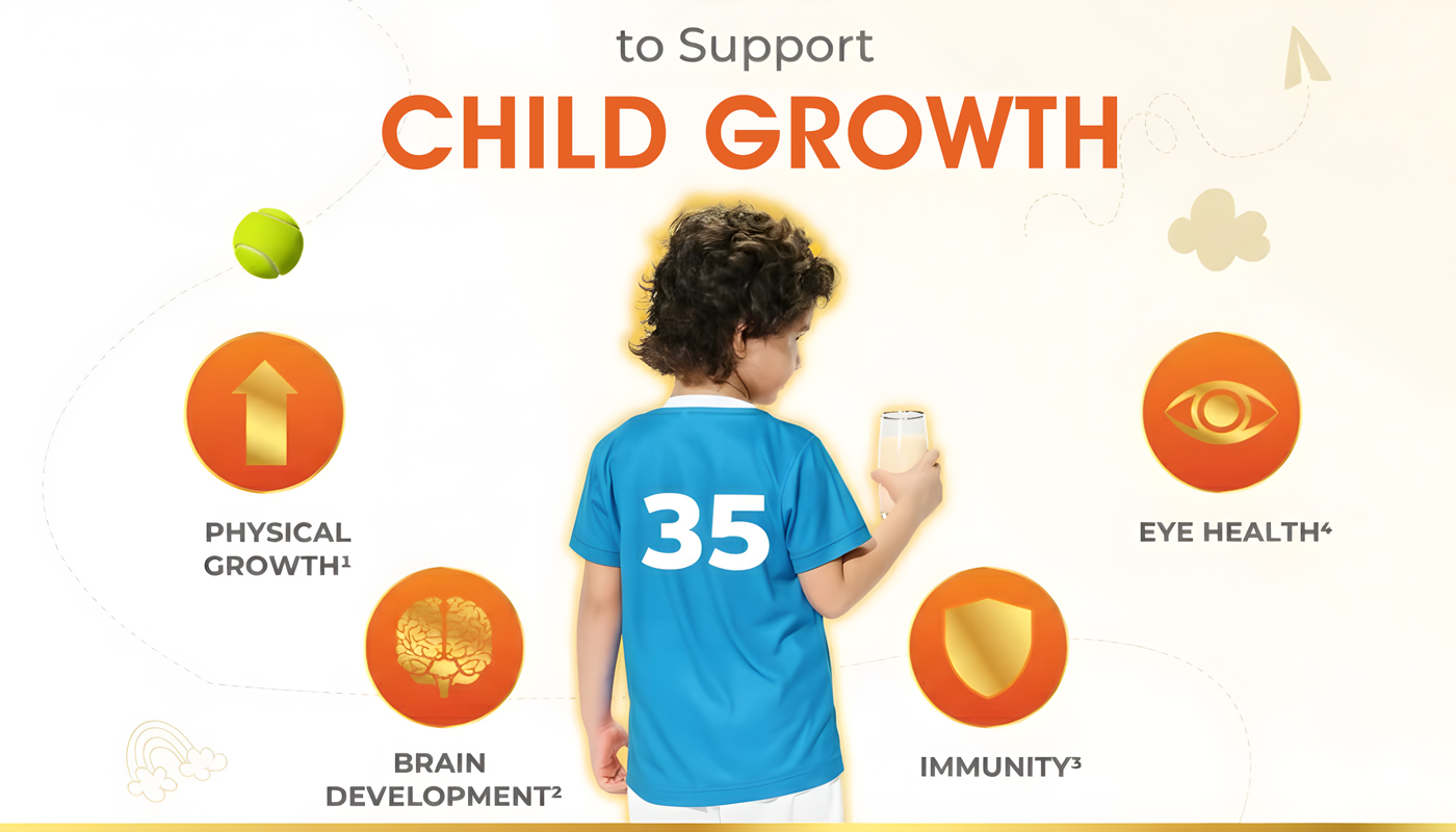 Gluten-free growth formula enriched with DHA, calcium, and probiotics, supporting brain power, strong bones, energy, and overall physical development in children.